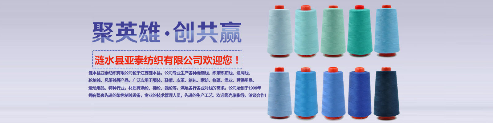漣水縣亞泰紡織有限公司位于江蘇漣水縣,公司專業(yè)生產(chǎn)各種縫制線、織帶織布線、漁網(wǎng)線、輪胎線、風箏線等產(chǎn)品,廣泛應用于服裝、鞋帽、皮革、箱包、家紡、帳篷、漁業(yè)、勞保用品、運動用品、特種行業(yè),材質(zhì)有滌綸、錦綸、氨綸等,滿足各行各業(yè)對線的需求。公司始創(chuàng)于1998年,擁有整套先進的染色制線設(shè)備,專業(yè)的技術(shù)管理人員,先進的生產(chǎn)工藝。歡迎您光臨指導、洽談合作!